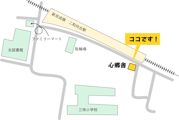 事業所案内 新京成線「二和向台」駅 徒歩2分 三咲小学校そば 二和向台駅改札からの案内 改札を出てすぐ左側の出入り口からでる線路を左手、駐輪場を右手にまっすぐ進む右手の3階建てのビルが心郷舎です 心郷舎入り口 新京成の線路が目の前 バルコニーから 新京成ファンには格別な場所 気分転換になります。 仕事の息抜きに深呼吸 PC事業所 南向きで風通しも抜群! 窓を開ければ富士山も見えるかも…? 作業場所 楽しく就労します。 分からないことは丁寧に教えます。 心配ご無用! いいね 読み込み中…